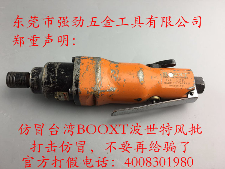 我司旗下BOOXT品牌BX-10H氣動(dòng)螺絲刀風(fēng)批上市十多年,品質(zhì)一直很穩(wěn)定,在市場(chǎng)上已經(jīng)積累了不少粉絲。而最近,我司做售后維修時(shí)發(fā)現(xiàn),有些看起很“真”的BX-10H看起來用了沒多久,卻要維修了,而且客戶明言保修。經(jīng)過簽定才發(fā)現(xiàn),這不過是李鬼而已,品牌標(biāo)識(shí)、烤漆、機(jī)身防偽、工藝等明面上的信息已經(jīng)深深出賣了它。李鬼,對(duì)于終端使用者來講,有時(shí)確實(shí)很難辨認(rèn)。而所購(gòu)買的氣動(dòng)螺絲刀風(fēng)批是否為正品?能否保證工具品質(zhì),這個(gè)已經(jīng)嚴(yán)重影響了生產(chǎn)秩序。