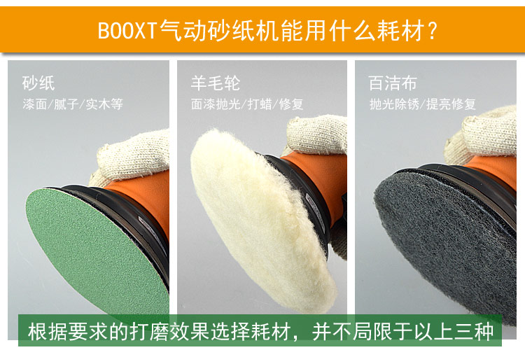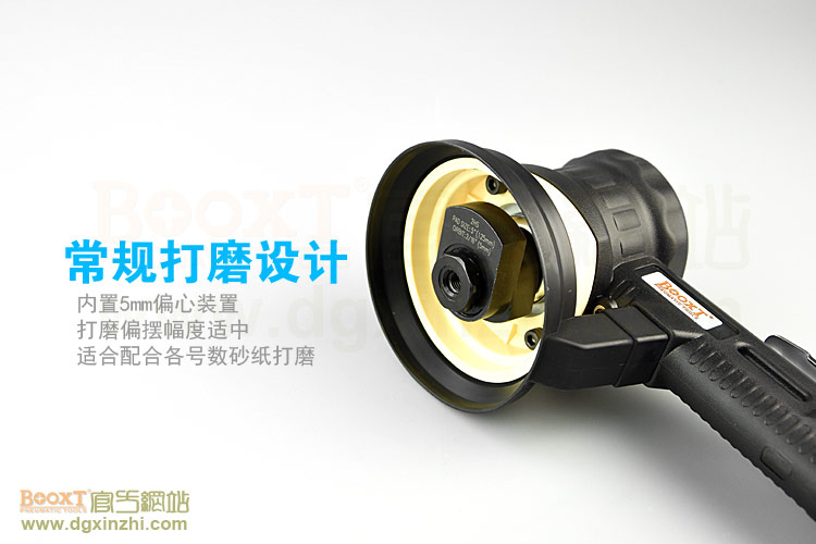 --粗磨偏心度幅度為9.5mm,扭力大,切削能力更大,適合重力打磨。工件一般幅面較大,要求打磨速度快,粗糙的打磨表面,如:玻璃鋼,UV,原子灰等材質(zhì)比較硬的工件,所用砂紙規(guī)格120#以下;