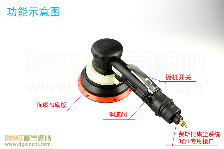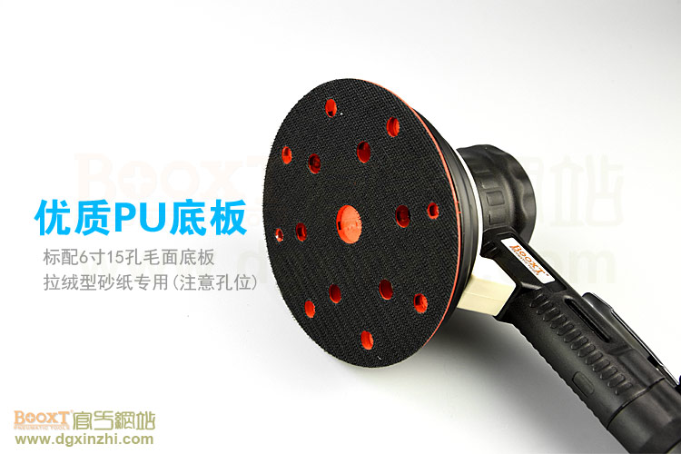 • 產(chǎn)品參數(shù): 底盤尺寸:6寸(150mm);轉(zhuǎn)速:10000rpm;偏擺:5mm;重量:1.2kg;使用氣壓:0.65Mpa;推薦內(nèi)徑8mm氣管;耗氣量:0.53立方米/分鐘;機(jī)器使用時多加氣動油保養(yǎng);需搭配集塵桶或中央集塵設(shè)備使用