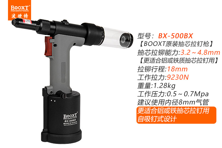 東莞市強(qiáng)勁五金工具有限公司提供臺(tái)灣BOOXT波世特品牌氣動(dòng)工具,自吸氣動(dòng)拉鉚槍BX-500BX廠家直銷,首件享特價(jià)。咨詢熱線:4008301980