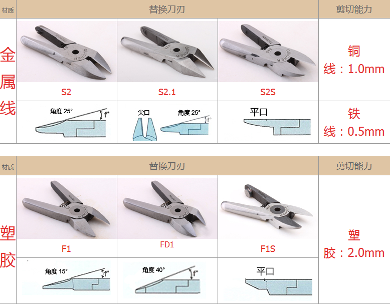 2.注意材質(zhì):材質(zhì)對選配刀刃非常重要,例如客戶要剪的銅鐵、材質(zhì)有鍍鈦、鍍烙、塑料材質(zhì)、加纖維超過20% 時,一般刀刃不是剪不斷,就是使用壽命大大減少,塑料還容易在剪斷過程中碎裂。在這情形S刀刃應(yīng)選擇Z刀,塑料則建議使用電熱剪。